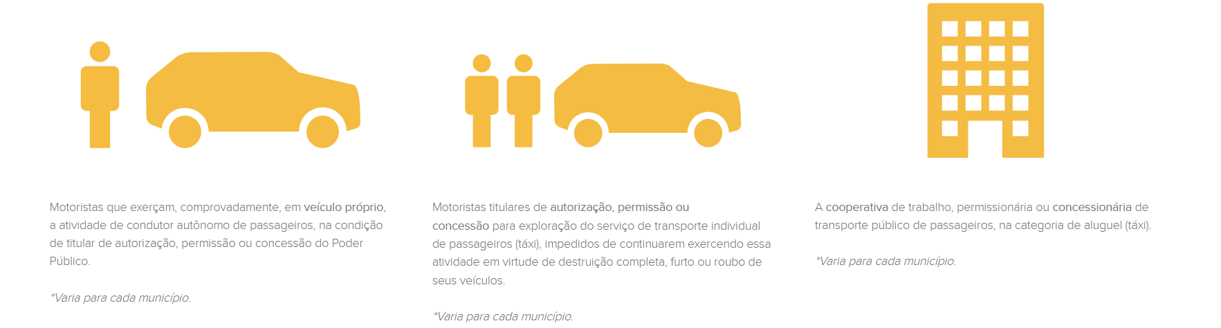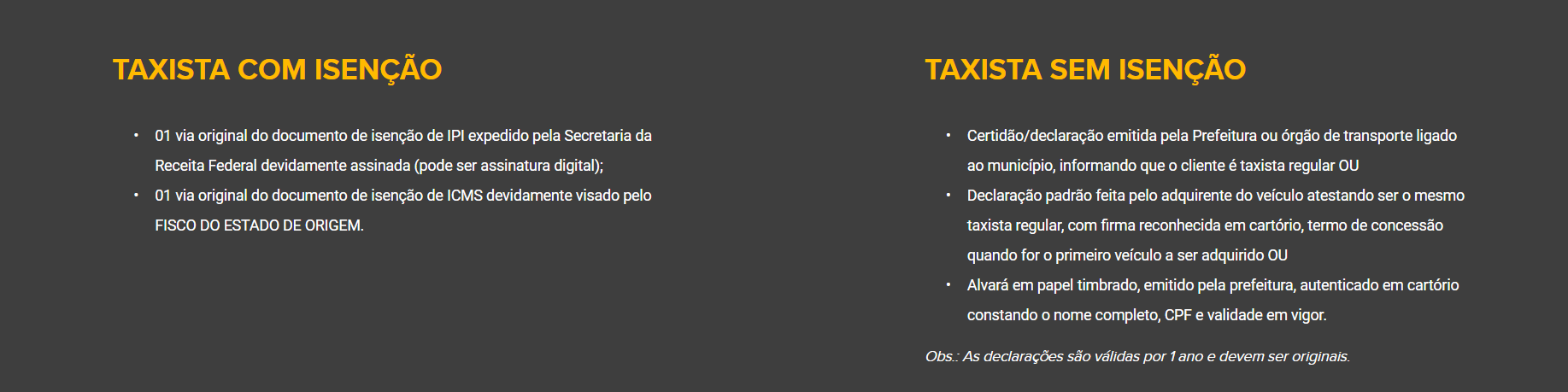 Obs.: Para reconhecimento da isenção entende-se como condutor autônomo de veículo o motorista proprietário de apenas um automóvel utilizado como táxi, admitida a propriedade de outros veículos, mesmo que para aluguel, desde que não utilizados como táxi. A propriedade será caracterizada na data do requerimento do benefício pelo interessado.